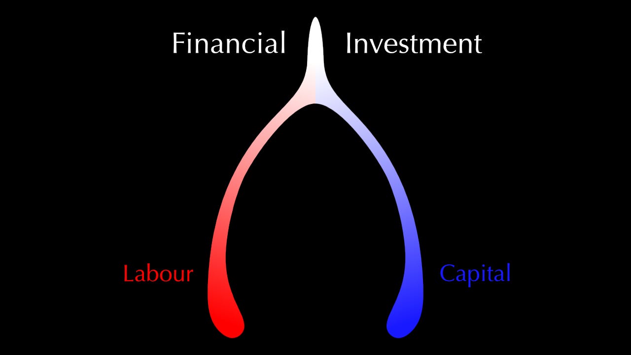 Traditional economics claims that there is a significant difference between labour and capital. Labour represents the interests of hired workers while capital represents the interests of business owners and corporations. Labour unions fight for the collective rights of workers while business associations push for the commercial interests of businesses. While there may be a significant difference of interests on the shop floor, as we move up the hierarchy within organizations into the pinnacle of finance, the differences disappear completely. A wishbone is a good analogy for the relationship between labour and capital.